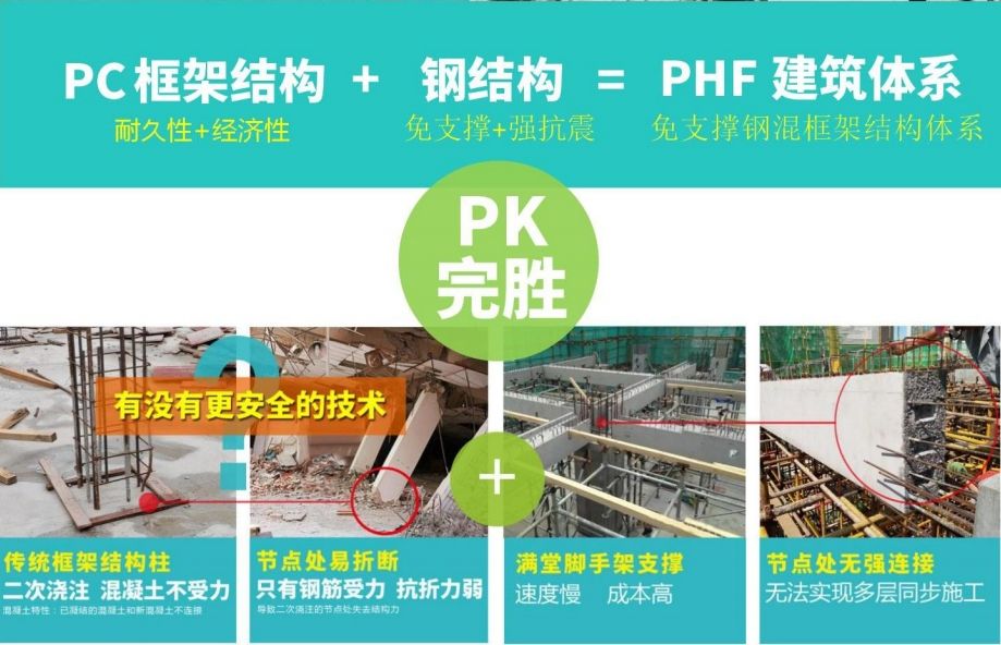 PHF建筑體系將 PC 構(gòu)件與鋼結(jié)構(gòu)連接方式有機(jī)結(jié)合、混合應(yīng)用,綜合了傳統(tǒng) PC 結(jié)構(gòu)和鋼結(jié)構(gòu)的優(yōu)勢(shì),揚(yáng)長(zhǎng)避短,施工更高效、效益更顯著。為行業(yè)開辟了一條新的賽道。